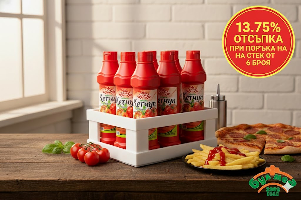 Насладете се на удвоено удоволствие с нашия Кетчуп Класик от "Булмед 2002" във голяма PVC бутилка от 0.900 кг. Този класически кетчуп е създаден с балансиран, наситен вкус, който перфектно допълва всякакви ястия – от хрупкави картофки и сочни бургери до любимата пица и скара.