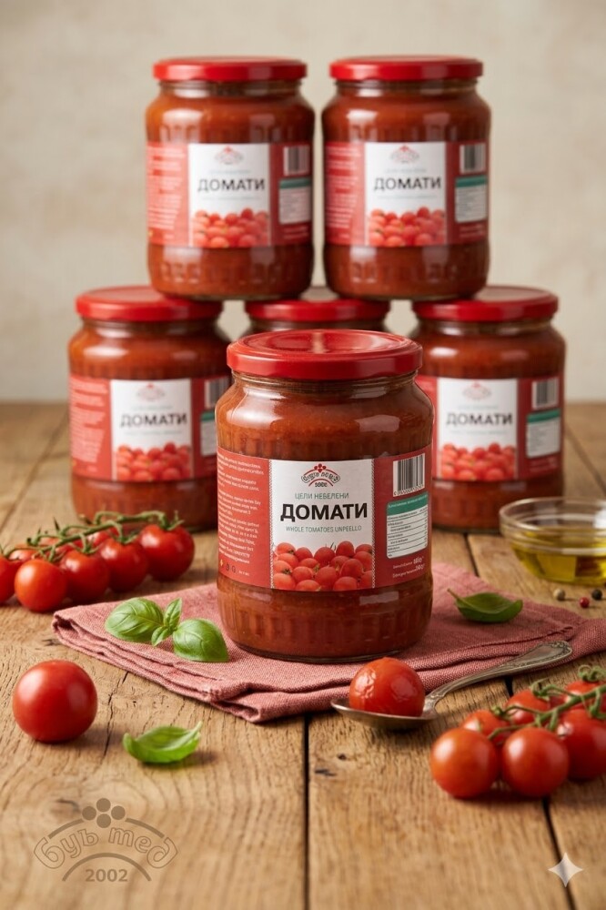 Натурален състав: Всеки буркан от 680 гр съдържа цели домати в гъста заливка – без захар и излишни добавки.